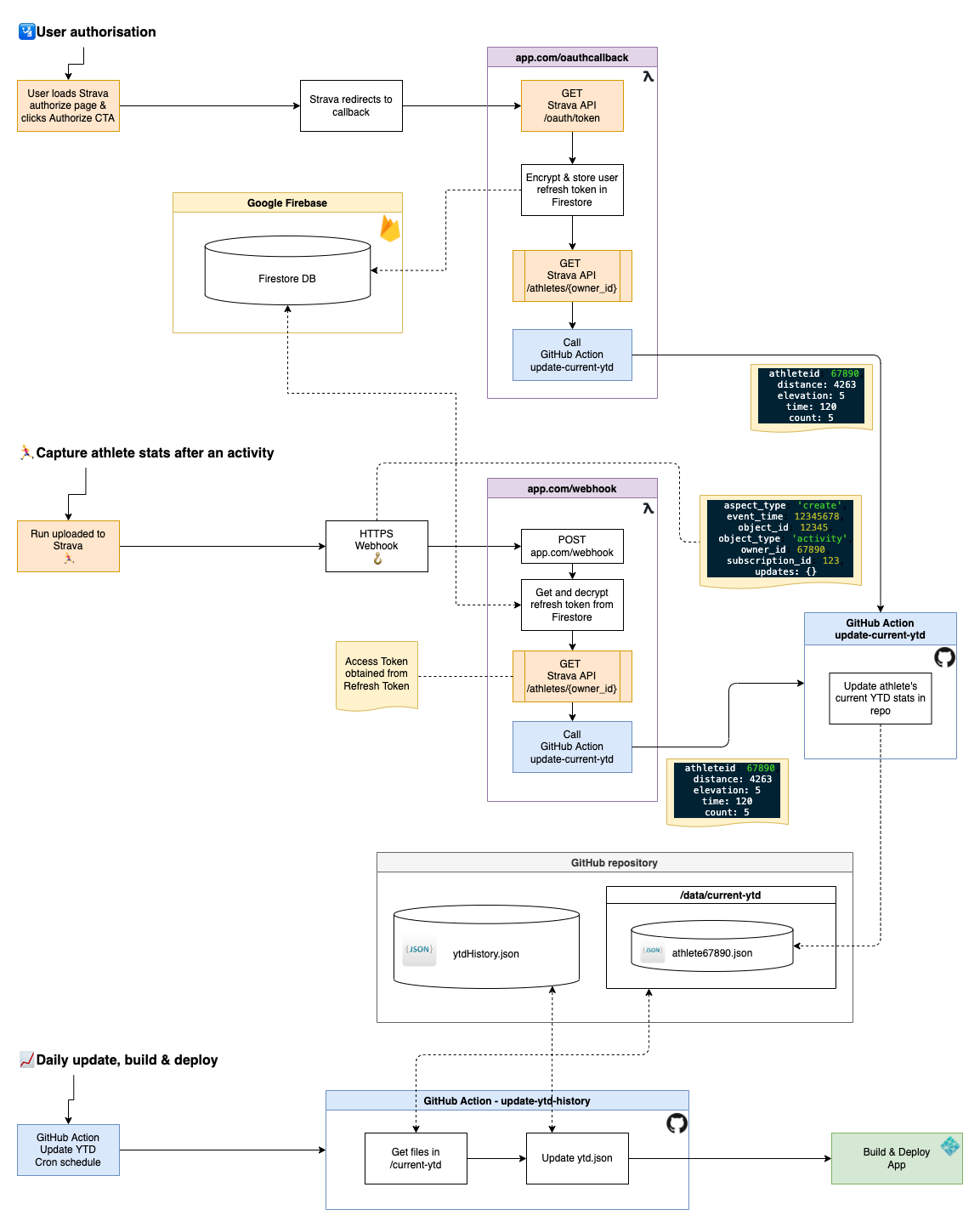 The refresh_token is encrypted and stored in the Firestore DB, and the access_token is used to obtain and store the initial Year-To-Date stats of the user.